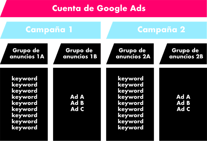 Para las campañas de búsqueda, te aconsejamos organizar los anuncios en grupos para cada palabra clave. Así podrás ver qué keywords funcionan mejor y las podrás optimizar en el texto de los anuncios.